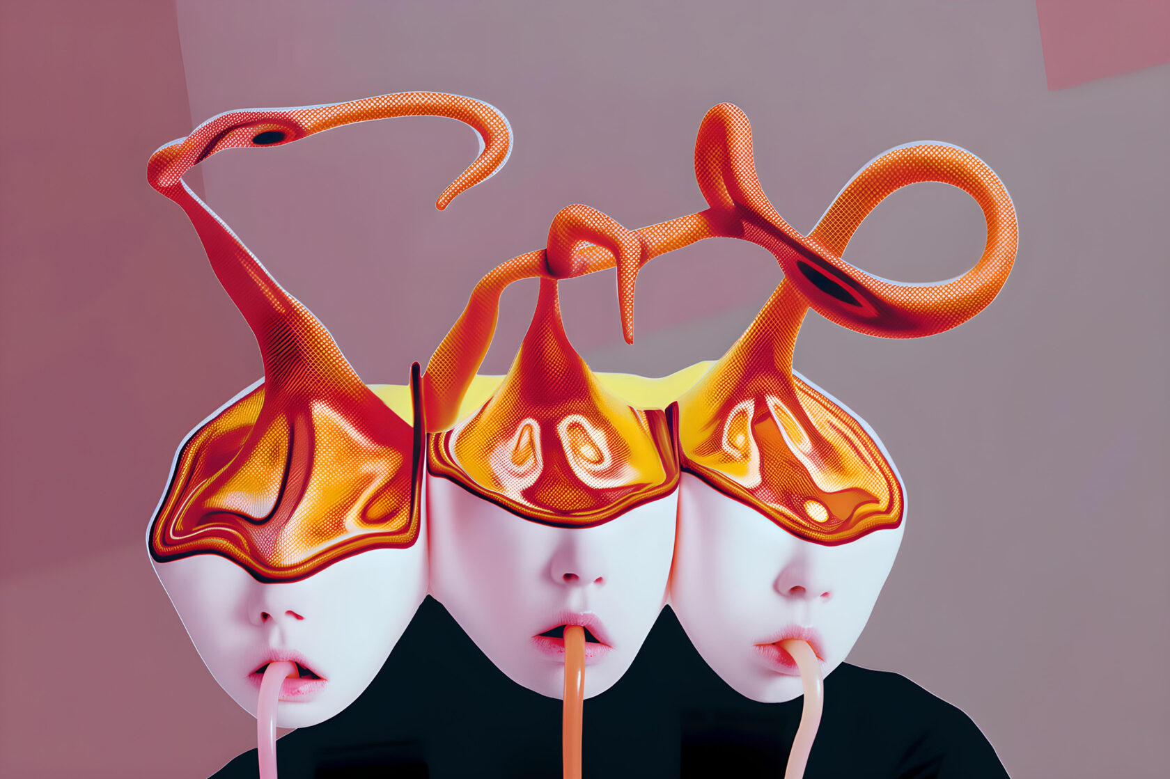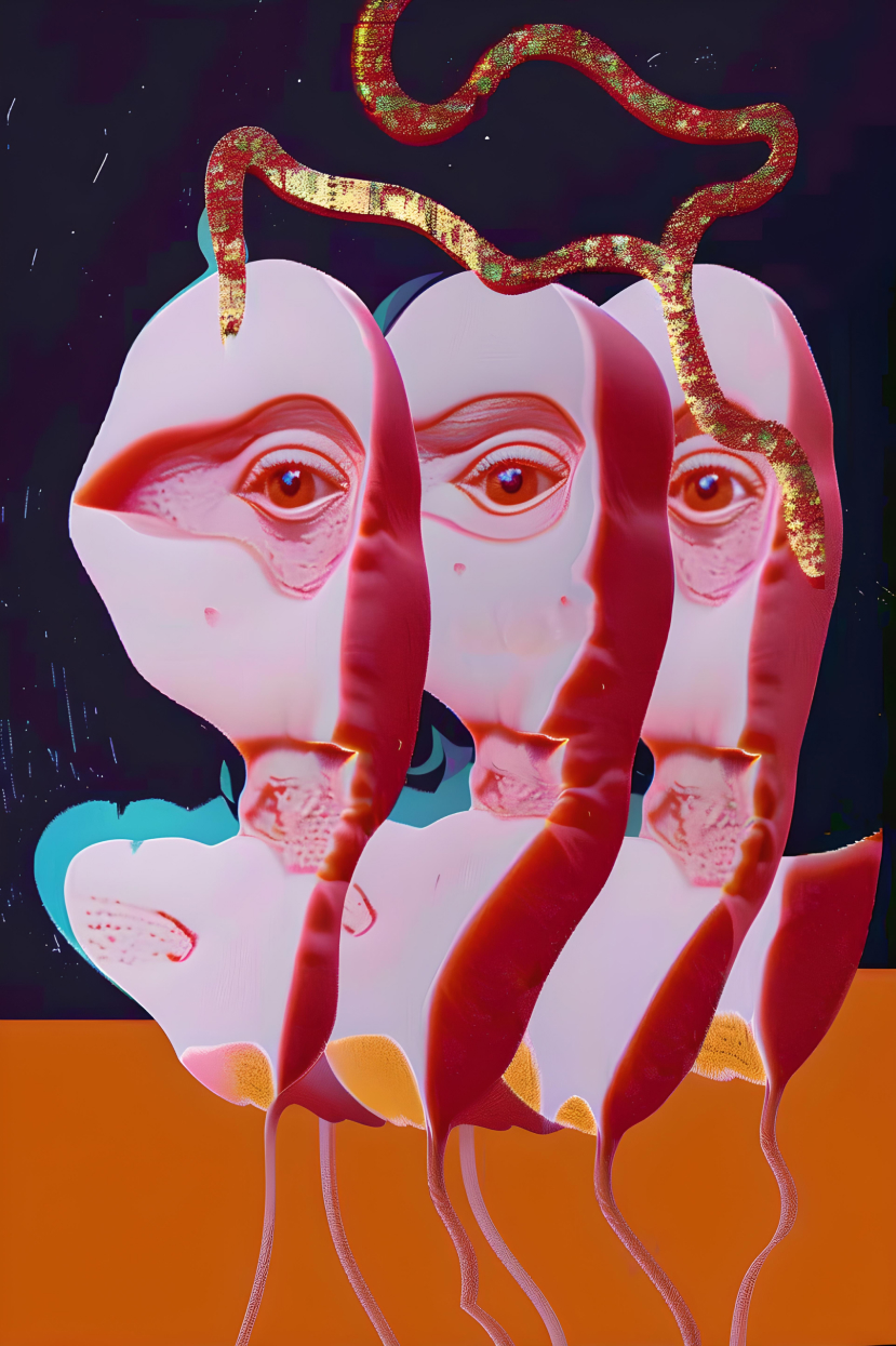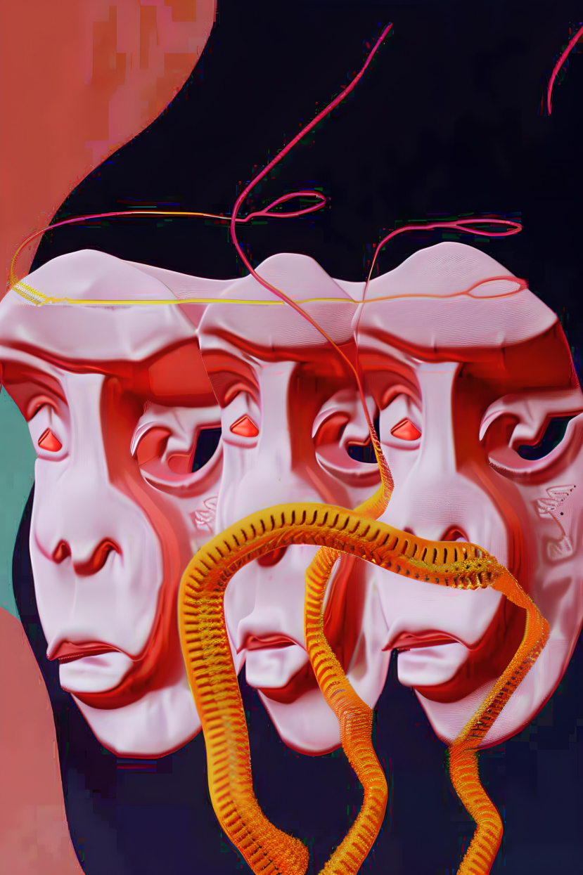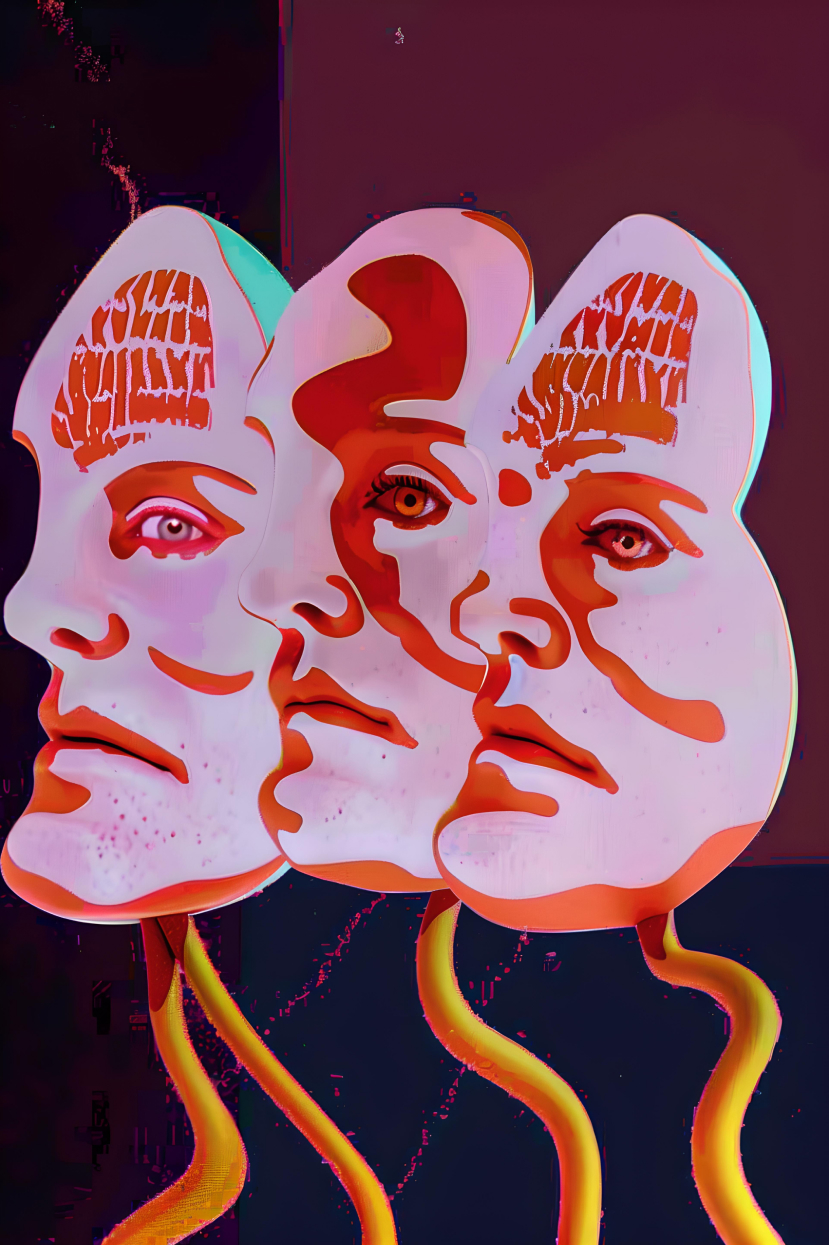 This series of works is an exploration of the paradoxical nature of human existence, where a strange and nebulous reality serves as a mirror for our inner worlds. The artist delves into the concept of social masks and subpersonalities—not merely concealing us but actively shaping who we are. These masks function not only as a form of protection but also as a creative tool, enabling us to become someone new when the old self no longer suffices.