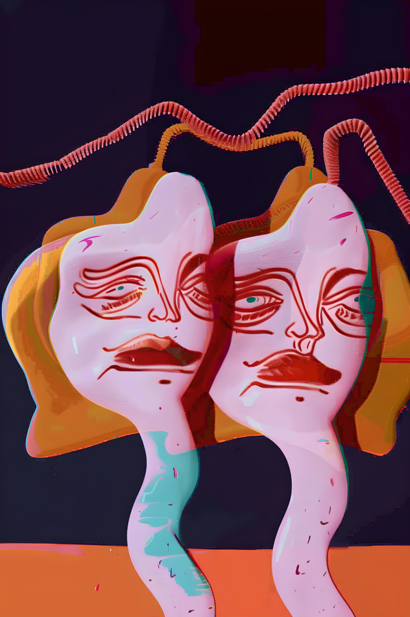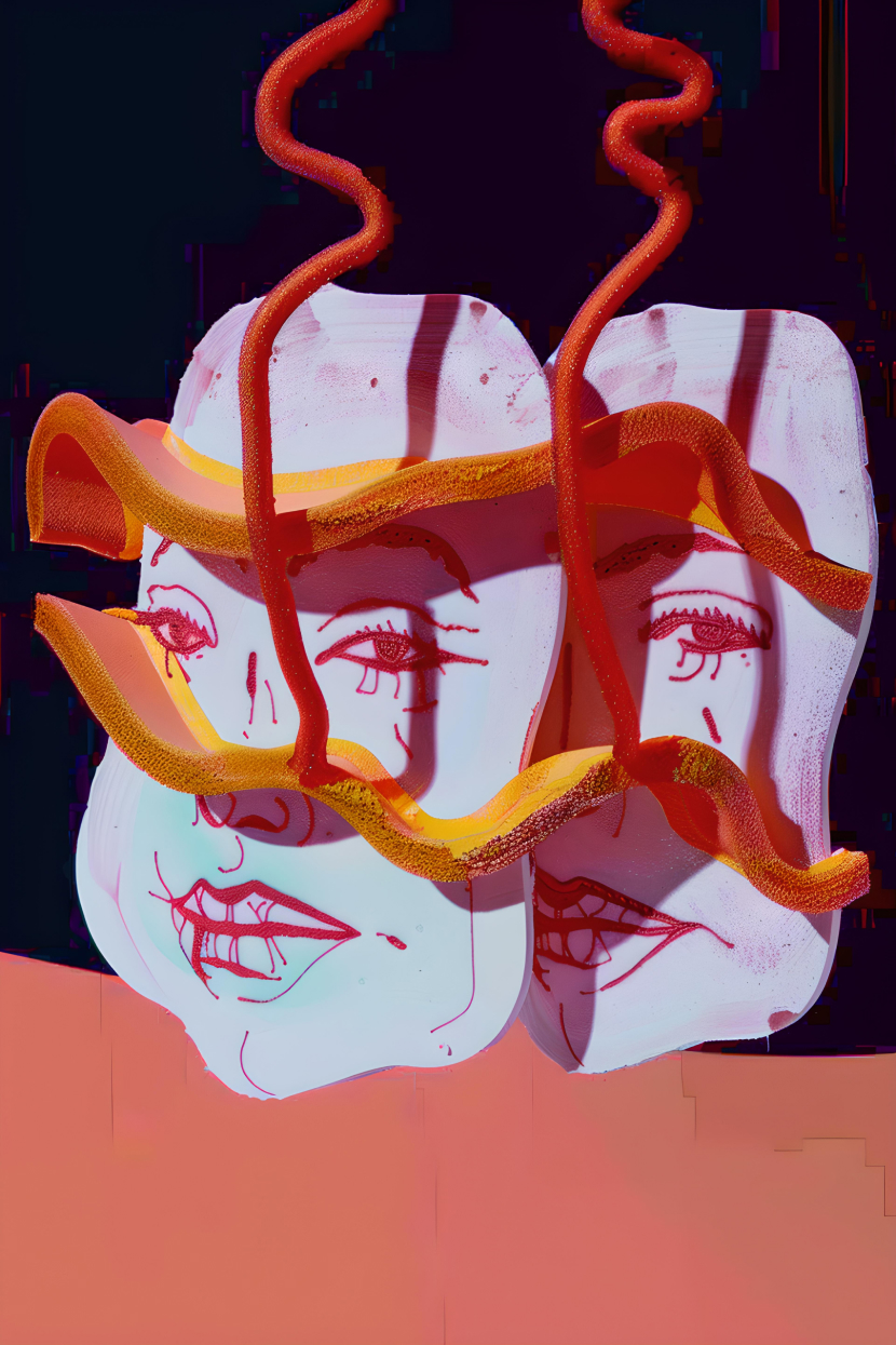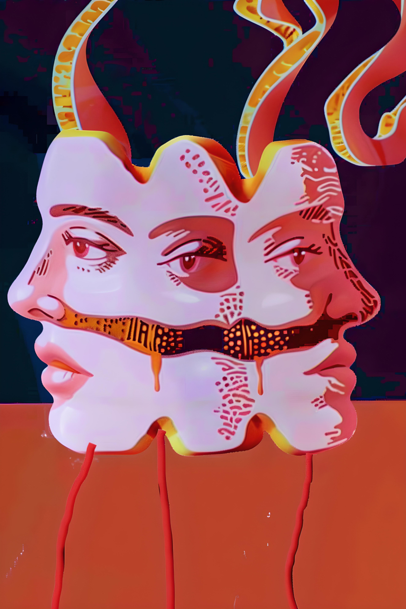 The works balance between chaos and order, the familiar and the unsettling. Distorted forms, layered textures, and fragmented lines mirror the inner conflict and the quest for identity in a world brimming with contradictions. This exploration is not only about seeing the mask but also about feeling how it presses upon us—or even becomes a part of us.